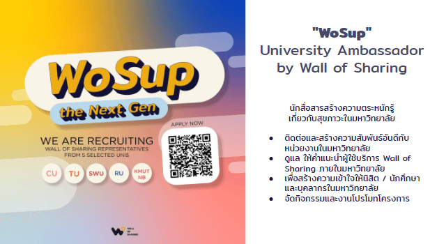 โครงการทูตนิสิตนักศึกษาของโครงการกำแพงพักใจหรือ ‘WoSup Project’ เพื่อช่วยเพิ่มประสิทธิภาพในการประชาสัมพันธ์โครงการ Wall of Sharing ปัจจุบันมีเครือข่ายอยู่ใน 3 มหาวิทยาลัย ได้แก่ จุฬาลงกรณ์มหาวิทยาลัย มหาวิทยาลัยธรรมศาสตร์ และมหาวิทยาลัยศรีนครินทรวิโรฒ